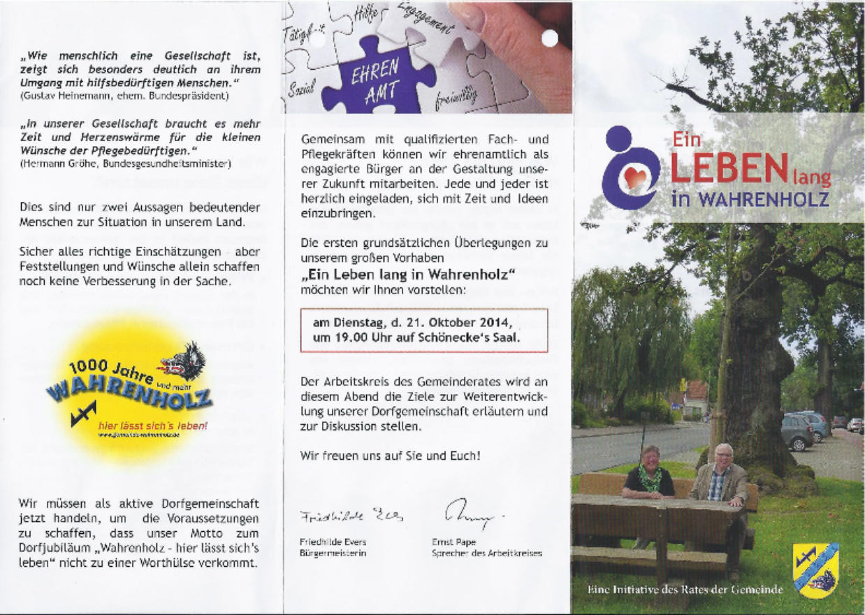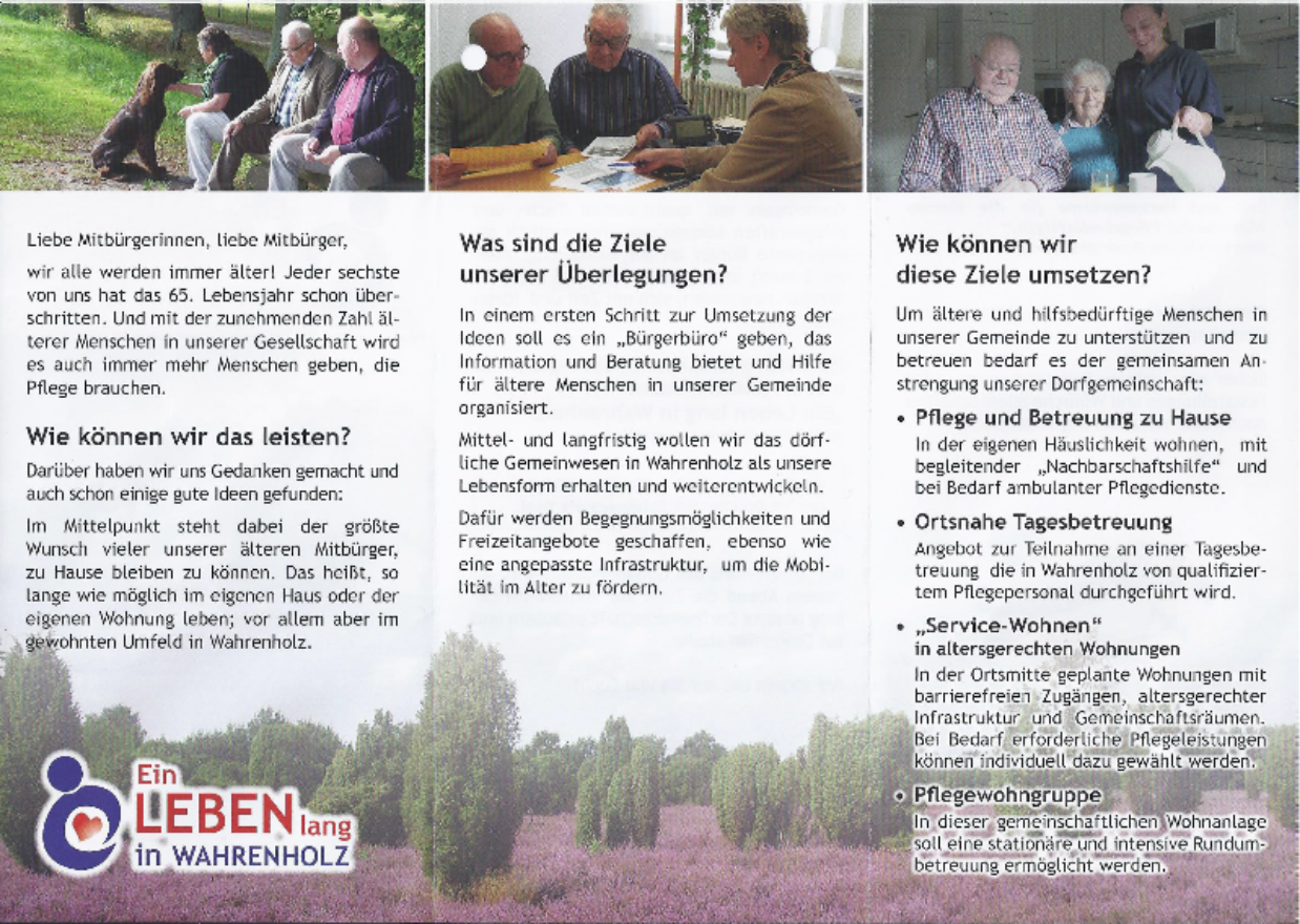 Aus eigenen Vorstellungen und Anregungen aus anderen Projekten entwickelte der Arbeitskreis dann ein Konzept für Wahrenholz. Dieses wurde im Oktober 2014 in einer Bürgerversammlung vorgestellt. Die Resonanz war ausgesprochen positiv, und eine Vielzahl der Anwesenden erklärte sich spontan bereit, das Vorhaben mitzutragen, sowie sich aktiv in die Umsetzung einzubringen. Im nächsten Schritt beschloss der Gemeinderat den Kauf eines 7.600 m² großen, zentral im Ortskern gelegenen Grundstücks. Hier entsteht die „Neue Dorfmitte“, in der ein Spektrum an Wohnmöglichkeiten im Alter einschließlich einer altersgerechten Infrastruktur geschaffen wird. Nahezu zeitgleich wurde die gemeinnützige „Bürgergemeinschaft Wahrenholz e.V.“ gegründet. Kommune und Bürgergemeinschaft erarbeiten von nun an gemeinsam das Konzept: „Ein Leben lang in Wahrenholz“.